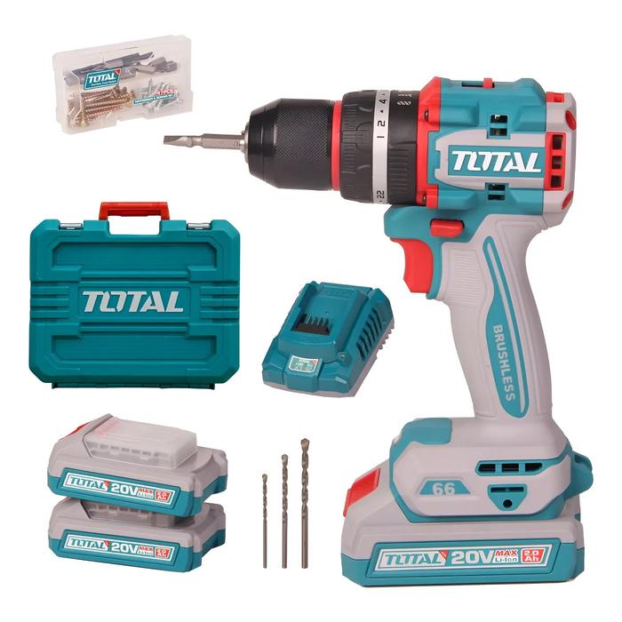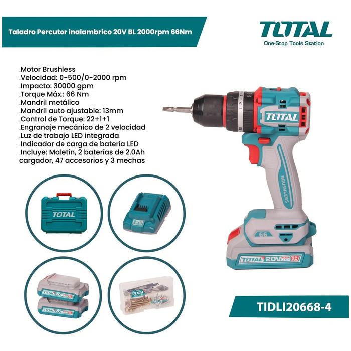 • Taladro Percutor inalámbrico 20V BL 2000rpm 66Nm INDUSTRIAL TOTAL TIDLI20668-4 (MALETIN, CARGADOR, Y 2 BATERIAS)