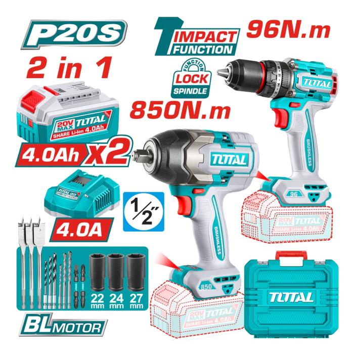 • Kit Taladro Percutor 96Nm + Llave de Impacto 850Nm Total 20V TOSLI250586-4